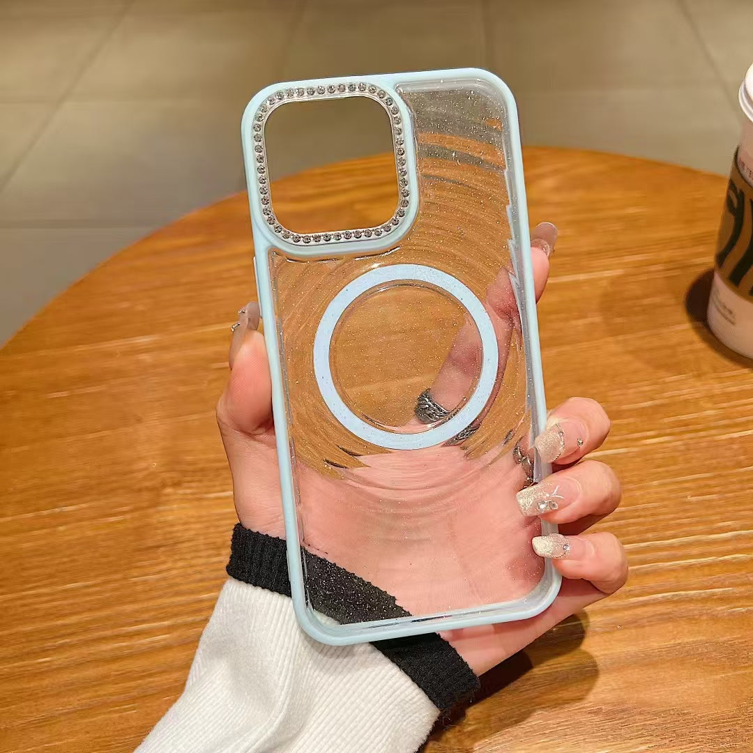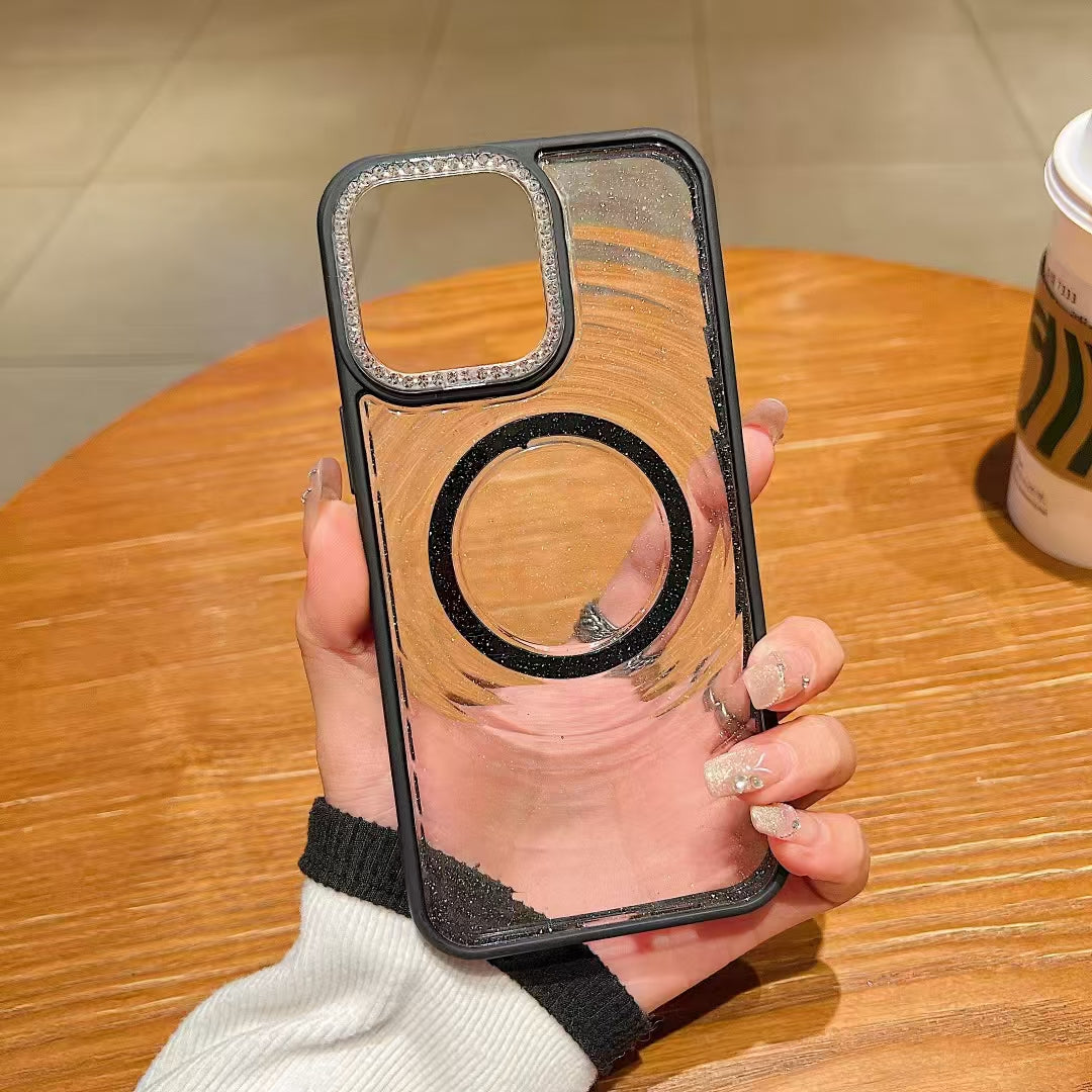 Wholesale Phone Cases Customizable Factory Direct Glitter Clear Magnetic Phone Case with Rhinestone Camera Ring for iPhone Shockproof Bling Cover